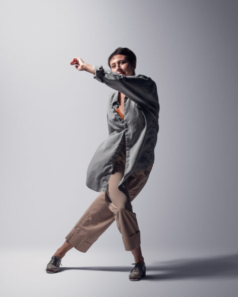 Kaleena wears a gray flowing shirt, khaki pants and gray tap shoes. She is mid-lunge, facing the camera, legs crossing and left arm swinging across body into the air.