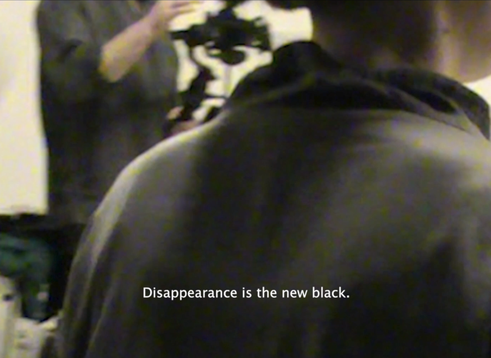 [ID: A performer’s upper back, close to the camera. Text reads: Disappearance is the new black.]