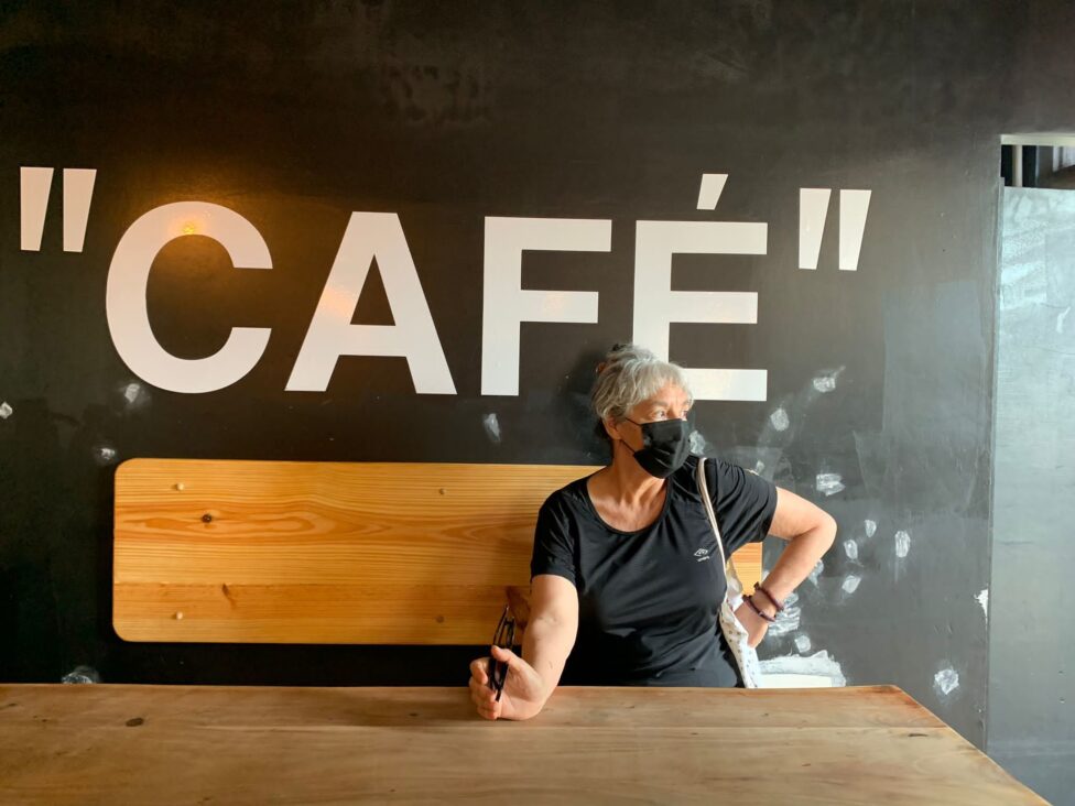 [ID: Myrna sits at a booth, looking off into the distance. She wears a mask and one hand rests on her hip, her other hand is holding a pair of glasses. Photo by Zuleira Soto-Román.]